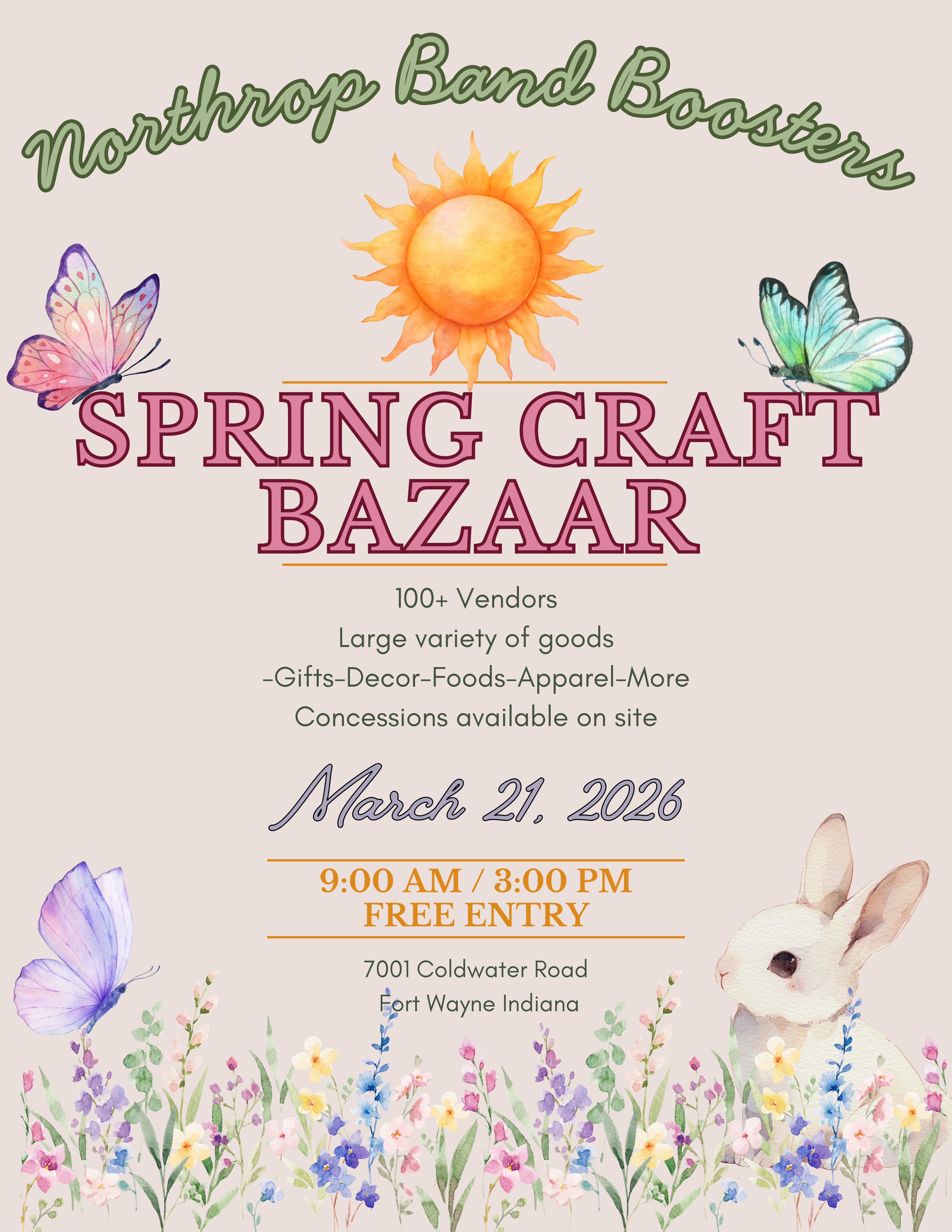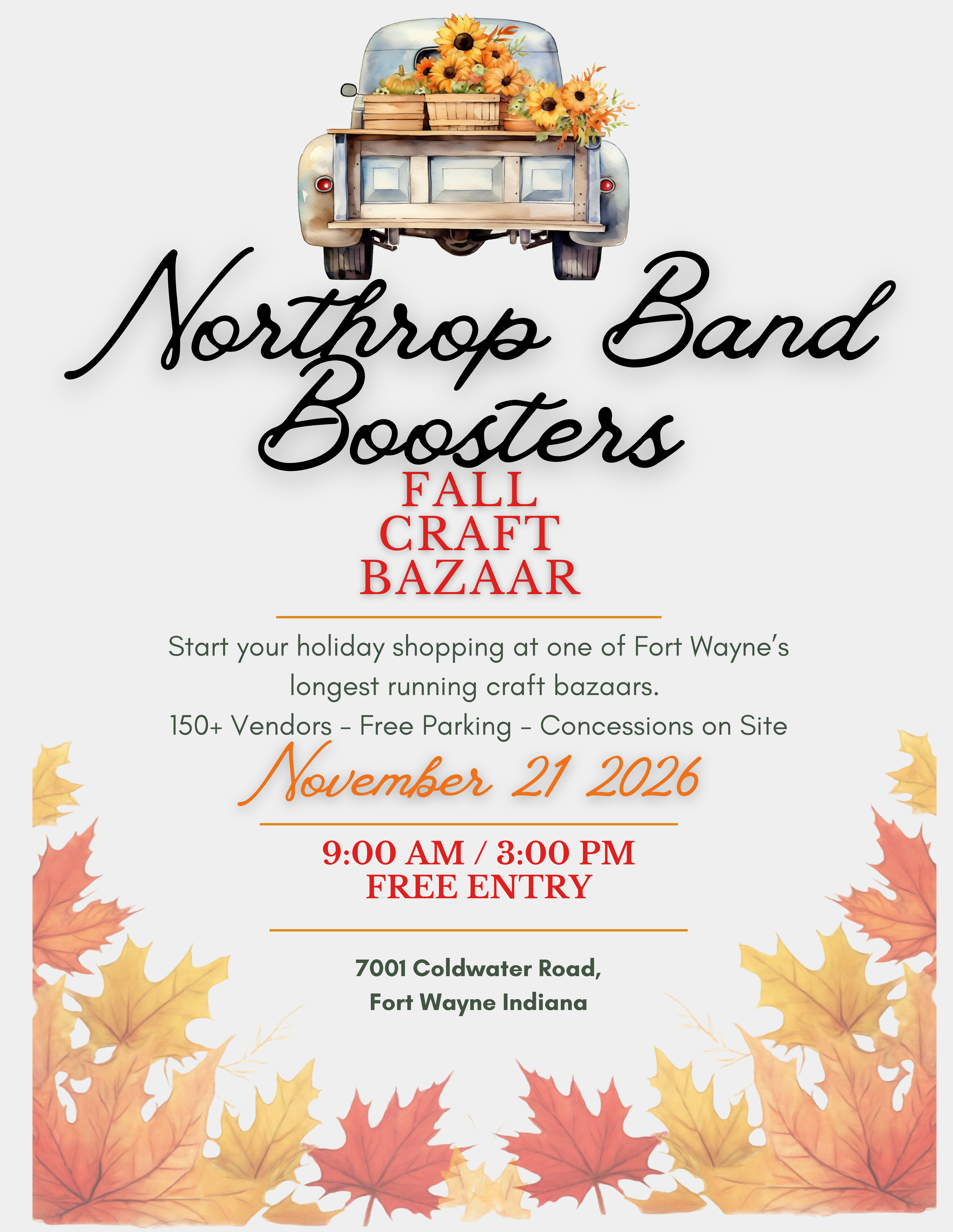 The Northrop Band Boosters host a fall and spring craft bazaar. This event has over 250 local and regional vendors selling handmade crafts, baked goods, and unique items. The Fall and Spring Craft Bazaar includes homemade candles, beauty items, apparel, jewelry, ColorStreet Nails, May Kay, gourmet breads, honey, books, Rada Cutlery, and much more!