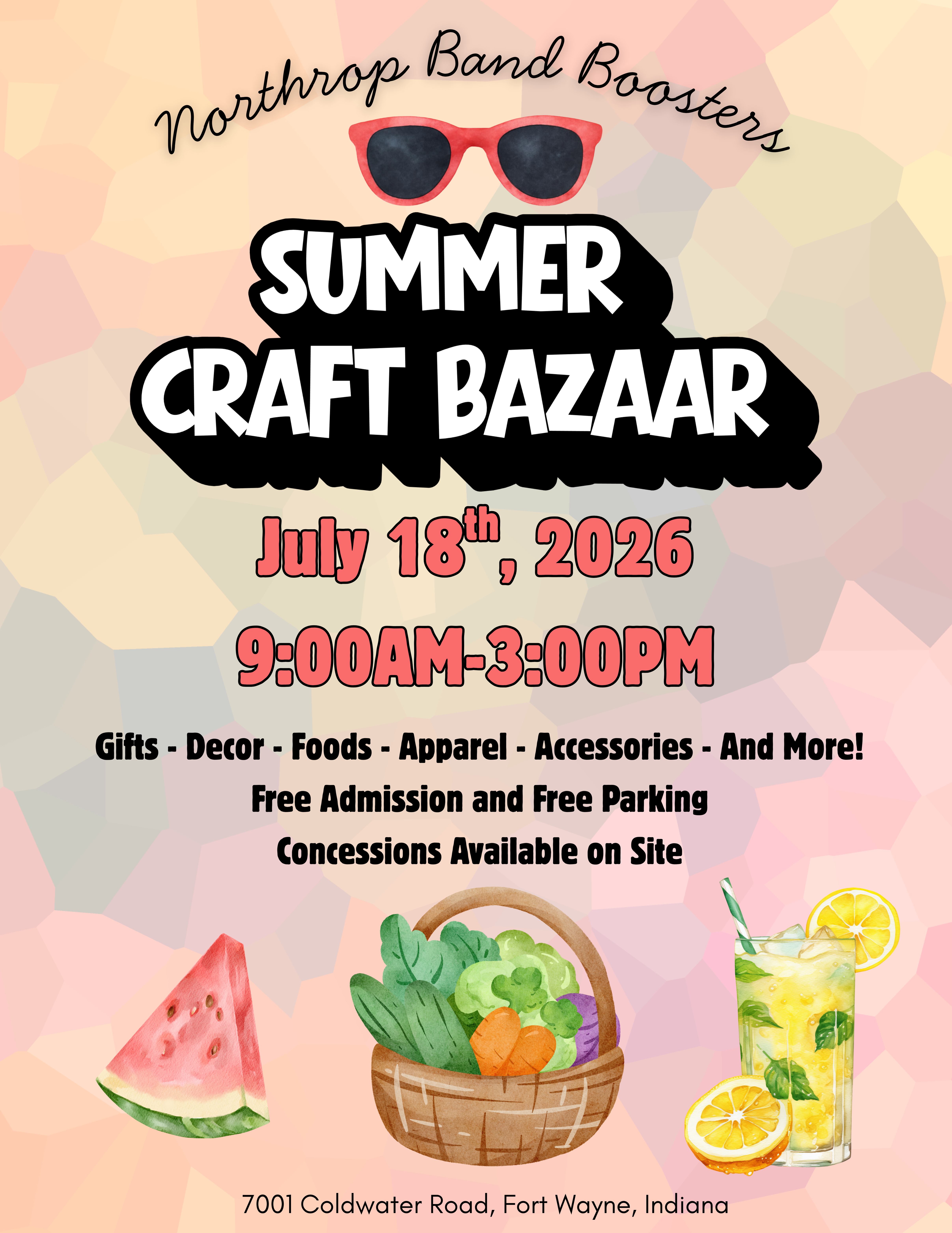 Northrop Band Boosters would like to host a summer craft fair and farmers market. Booth space will be $60 with an addition $10 for a table.