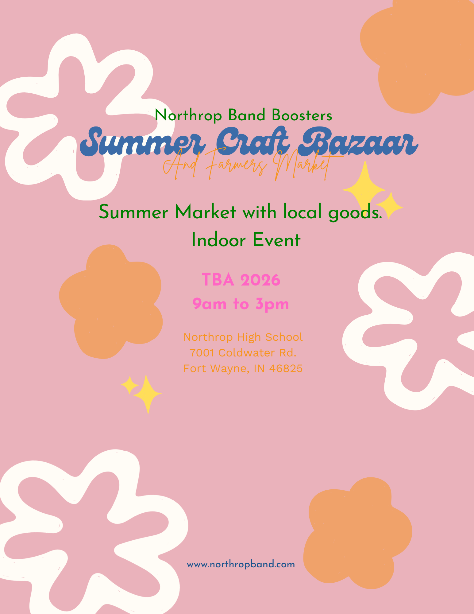 Northrop Band Boosters would like to host a summer craft fair and farmers market. Booth space will be $60 with an addition $10 for a table.